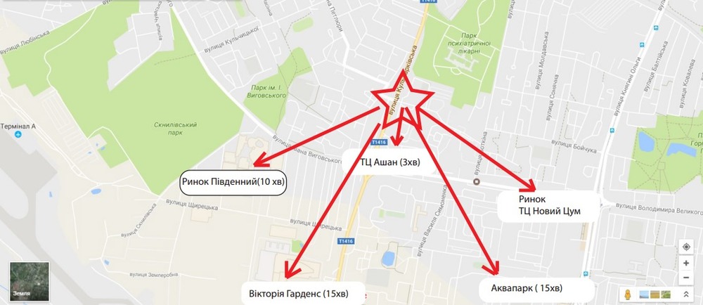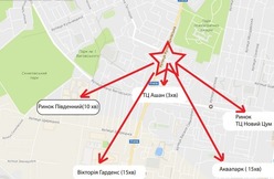 Зручне розташування, поруч гіпермаркет Ашан (3 хв пішки), ТВК Південний (10 хв), недавно збудований і відкритий ТРЦ Вікторія Гарденс (15 хв), також неподалік є Новий Цум та Аквапарк.